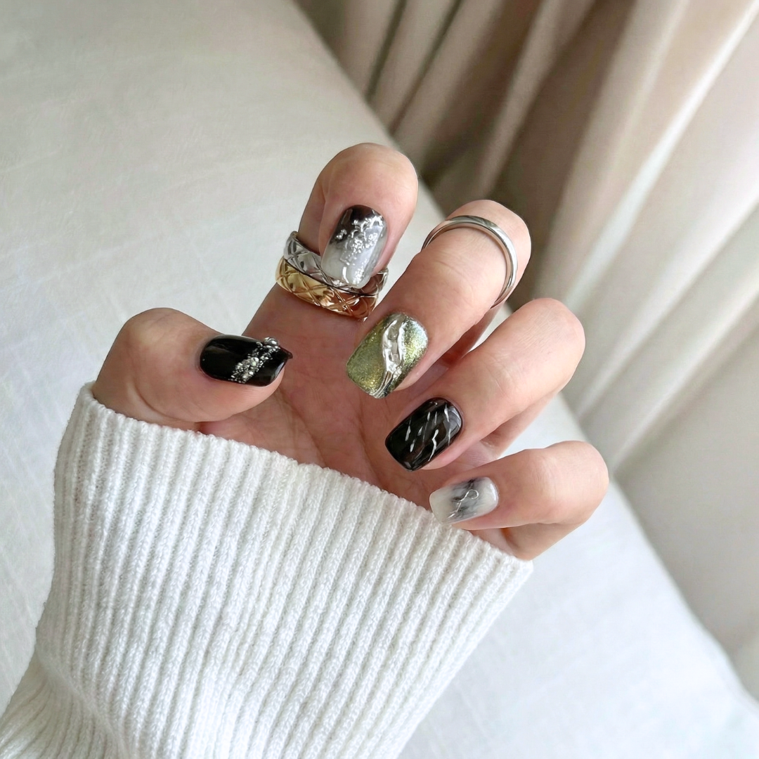 Unhas Koalli Press-On de Gel, feitas 100% à mão. Sente a intensidade da Tempestade Koalli. Um mix de preto profundo, tons esverdeados e reflexos metálicos que criam um efeito misterioso e marcante. Detalhes com brilho e contraste dão profundidade a cada unha, como relâmpagos num céu escuro.