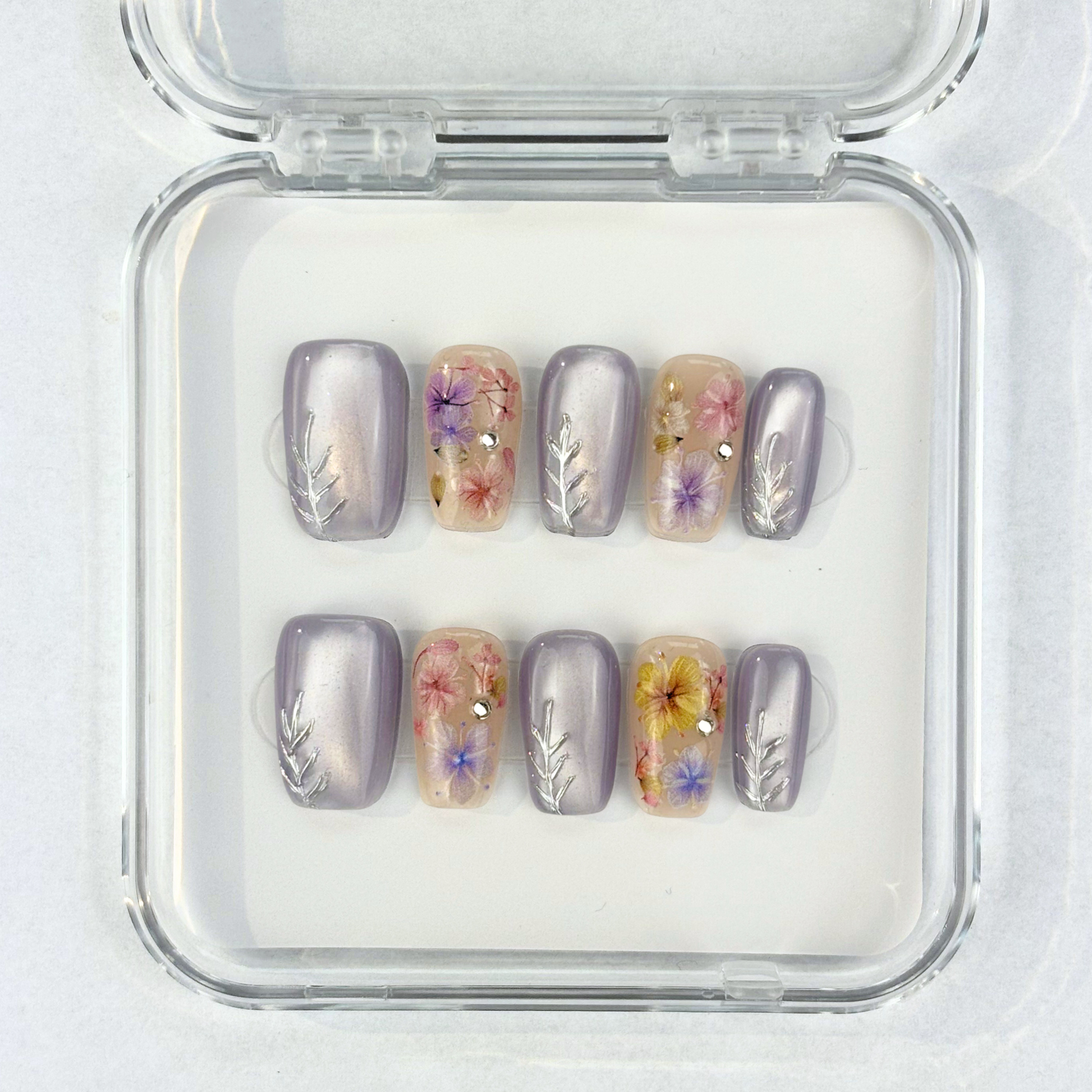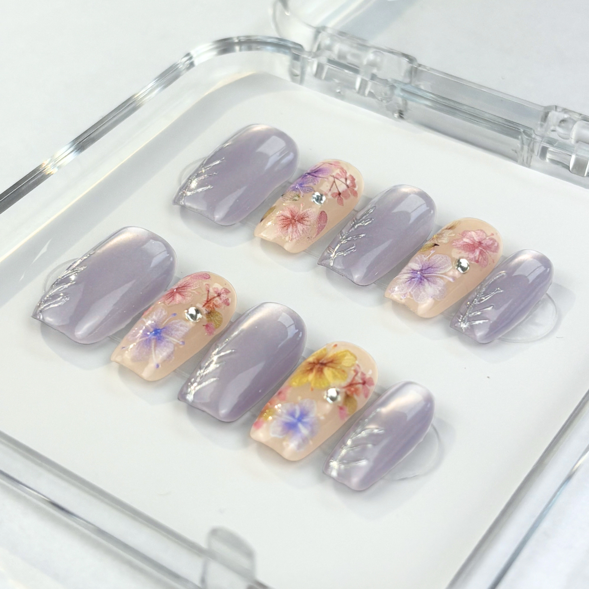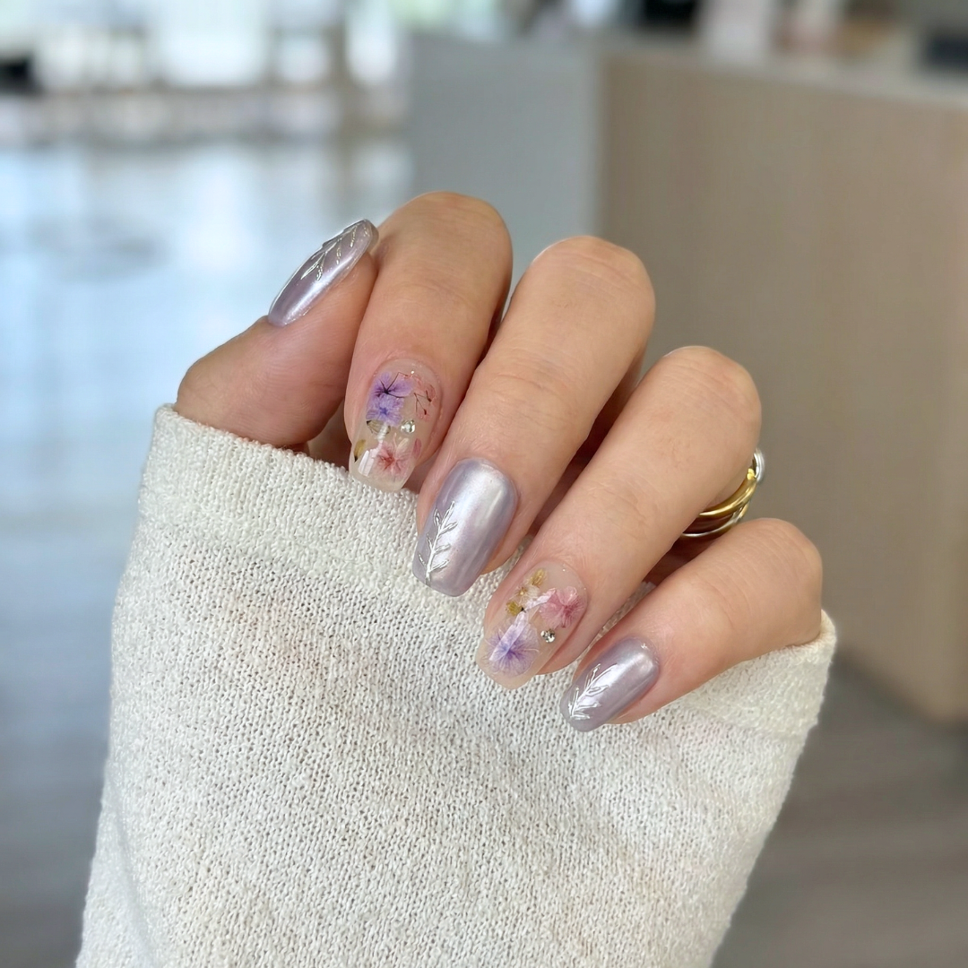 Adota a suave elegância das nossas unhas em Primavera Lilás. De um lilás suave com acentos prateados que fazem lembrar folhas e um toque de flores coloridas no indicador e no dedo anelar, nenhum dia de primavera ou jardim ficam completos sem elas.